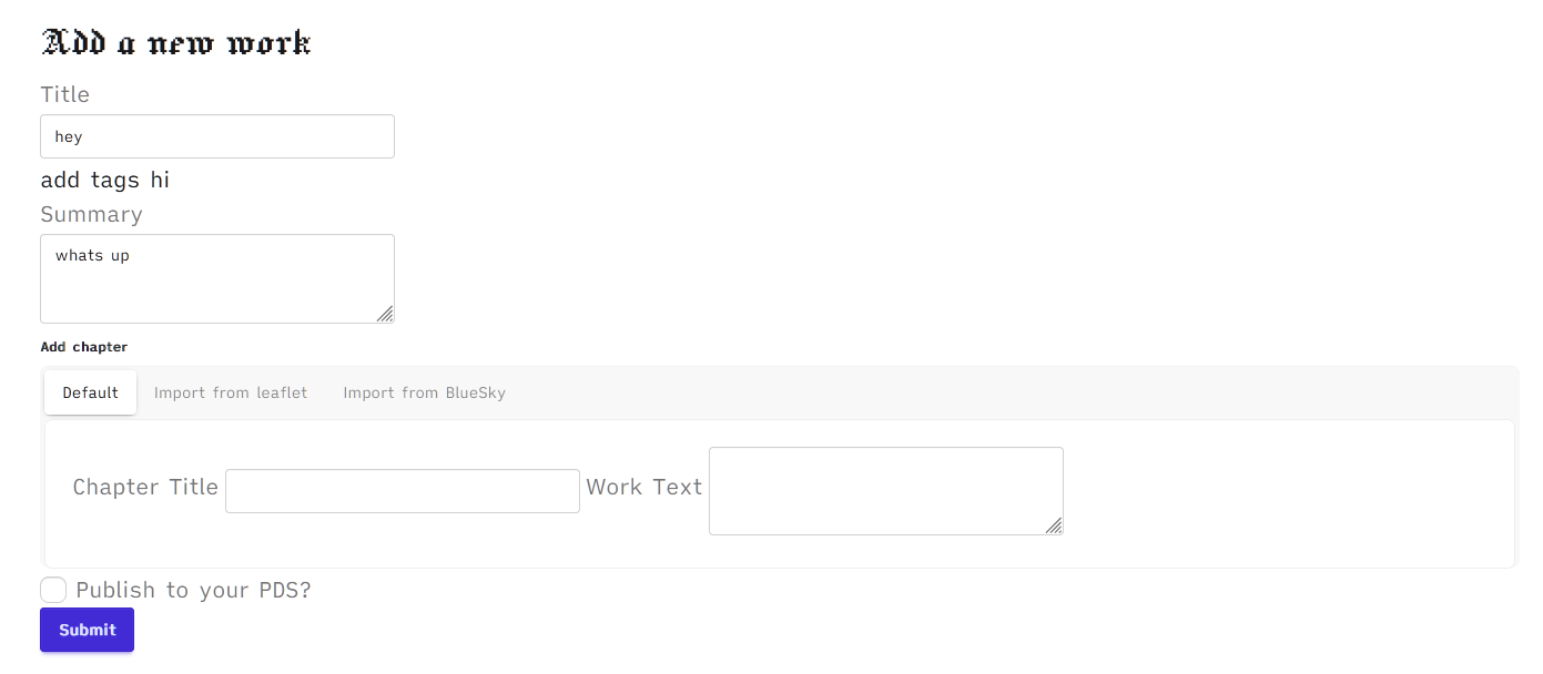 But! I've been meaning to wrap my head around importing or linking posts from other websites (like this one and BlueSky!) so writers can gather thread fics or micro fictions into something accessible -- or just publish to more platforms. I think this could unlock a lot cooler stuff in the future but I'm figuring things out as I go.
